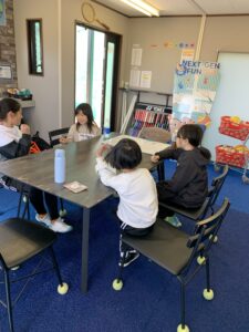 まずは、室内で自己紹介の後に、テニスのルール説明を行い、ポイントの数え方を覚えるため、ジャンケンで遊びながらでポイントを数える練習しました。